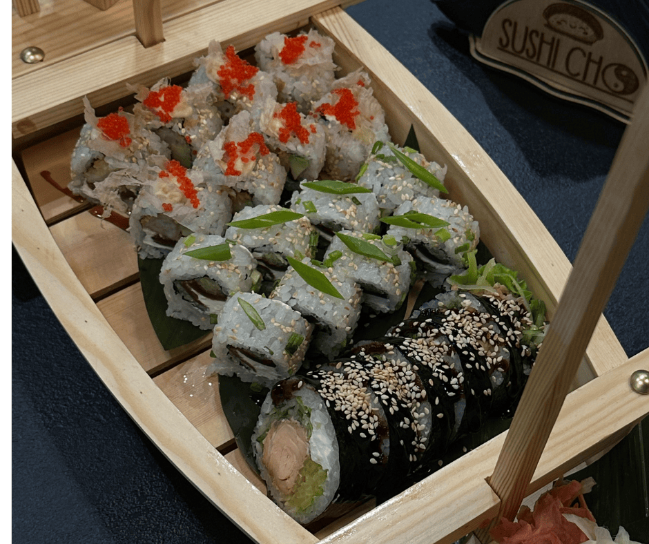 6szt - futomak sandacz w tempurze(serek sałata, sandacz, tykwa,awokado, ogórek, sos śliwkowy, płatki migdała)
